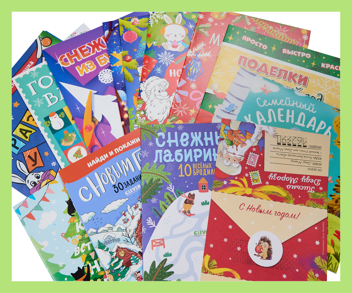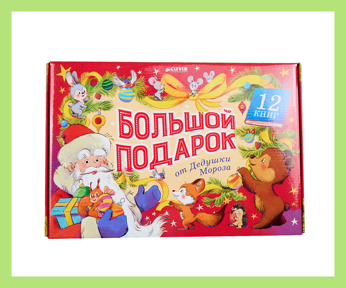 В подарочной коробке «Большой подарок от Дедушки Мороза. Комплект из 12 книг» издательства Clever собрано всё, что так любят малыши: раскраски, лабиринты, ребусы, активити, наклейки и поделки, а также новогодние рецепты, чтобы готовить вместе с мамой, и много чего еще.
