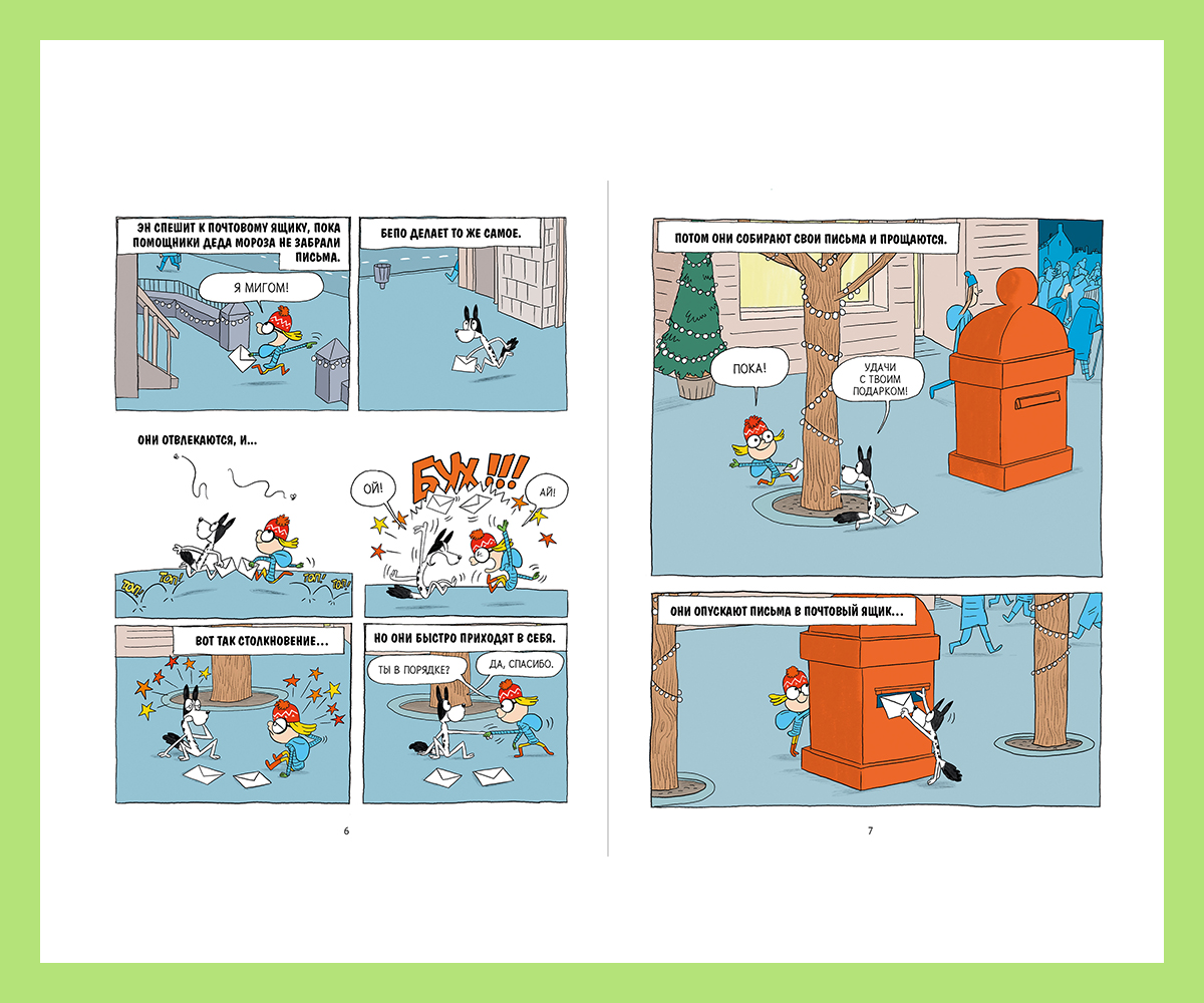 Автор этого новогоднего комикса, изданного «Альпина Дети», придумал веселую историю про девочку Эн и собаку Бепо. В канун Нового года они написали письма Деду Морозу, но что-то пошло не так, и их послания перепутали: Эн получила в подарок огромную кость, а Бепо – ракетки для бадминтона!